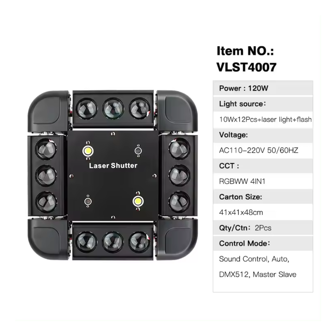 Enhance your stage lighting experience with the 12 PCS Storm Light (KM-MH13077)—a powerful 150W moving head light designed for professional stage performances, DJ setups, concerts, and clubs. Featuring 12x10W RGBW 4-in-1 LEDs, this high-brightness light delivers vibrant colors, dynamic effects, and sharp beam projections. With DMX512, master-slave, and self-propelled modes, you get full control over light movement, color mixing, and strobe effects. Its 5° beam angle ensures focused and intense lighting, while the durable LED lifespan of up to 10 million hours guarantees long-term use. Whether for live events, theaters, or parties, this storm light is your go-to choice for professional stage illumination.