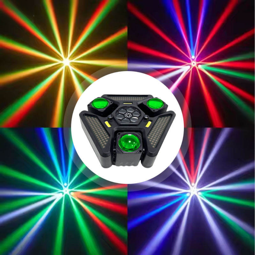 Equipped with 15 high-output CREE 10W RGBW LEDs, ultra-bright red and green lasers, high-speed white strobes, and 192 RGB SMD LEDs, the fixture delivers intense brightness, wide color mixing, and dynamic motion. The 360-degree rotating three-arm design ensures full venue coverage with smooth, synchronized movement.